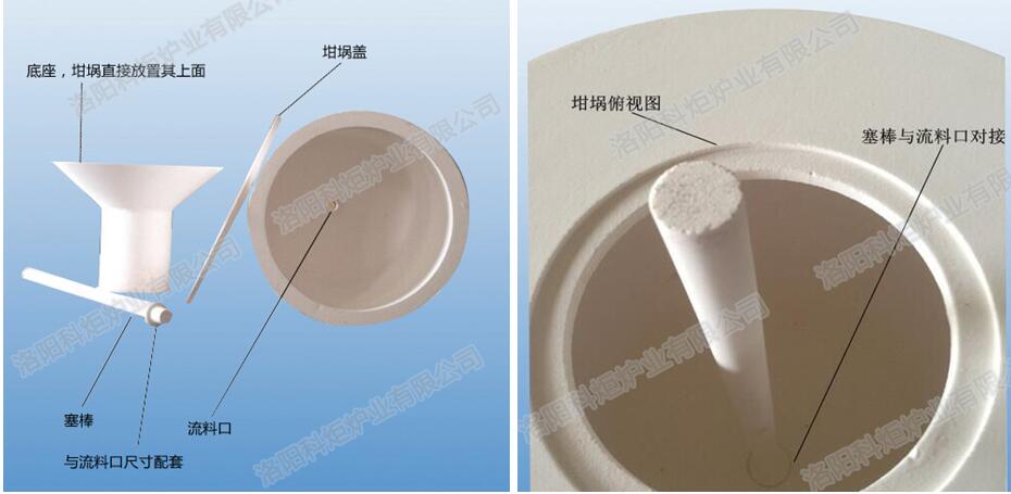 此陶瓷熔塊爐是將一個漏斗式坩堝置于爐內,將配好的熔塊料直接從上邊投入坩堝內,坩堝底部有圓形孔流料口,由一根長塞棒與坩堝底部流料孔密封對接。通電加熱,在加熱時塞棒處于下壓狀態(在自身重力下),與流料孔密封接觸,保證加熱過程不外漏。加熱完成之后將塞棒向上提拉,開始放料。相反如果松開塞棒,則停止流料;如需不同流速,可采用不同直徑的短塞子與長塞棒成套來控制。當溫度上升到指定溫度時,熔塊成熔融狀態,由下面的流料孔(坩堝底部有個孔)自動流入下面的容器中。在更換坩堝時,可降下升降平臺,方便更換。
